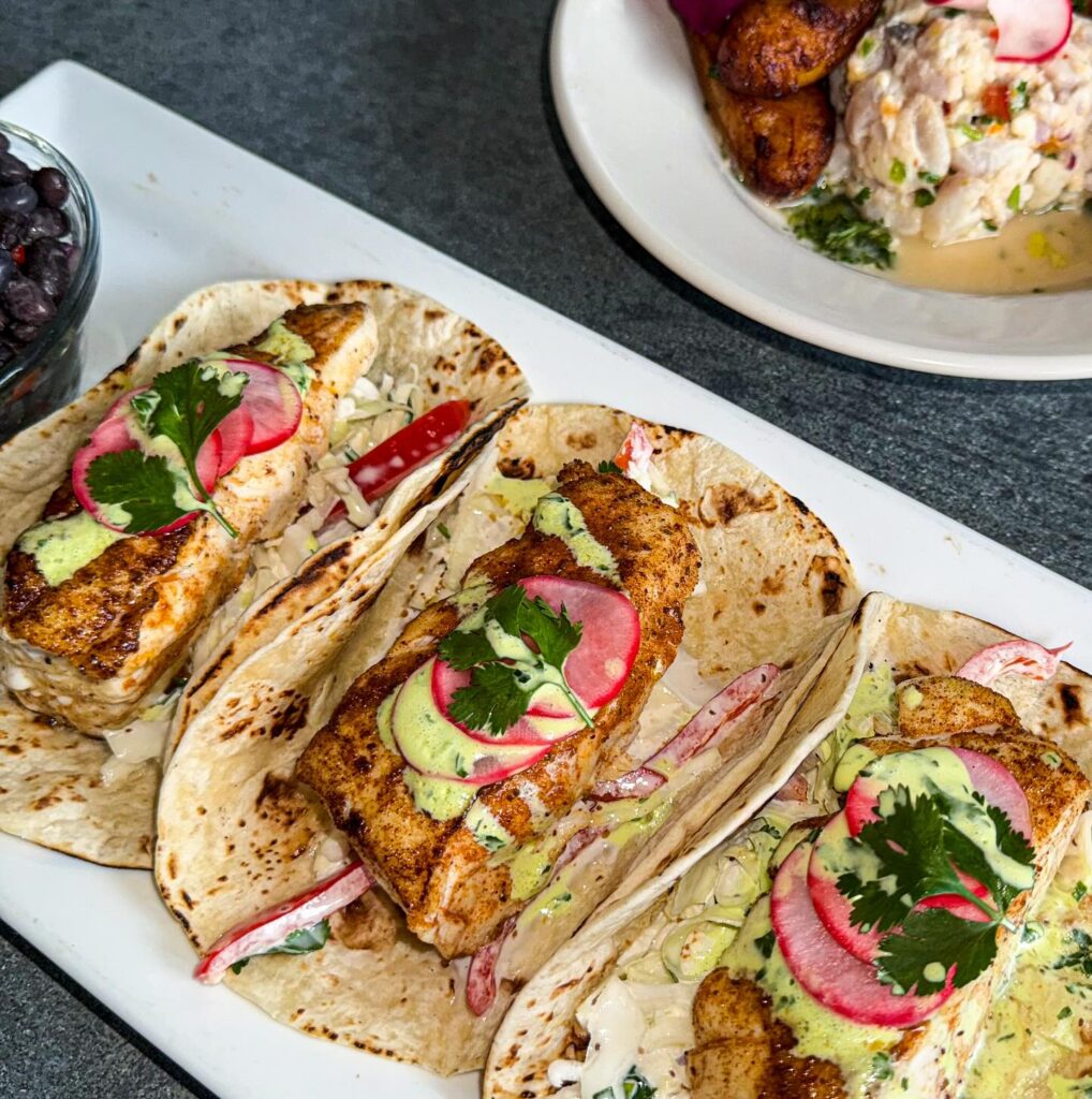 Blackened halibut tacos with red pepper slaw, pickled radishes, and cilantro lime crème in flour tortillas with black beans