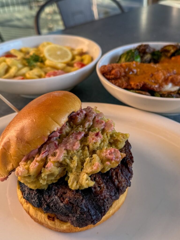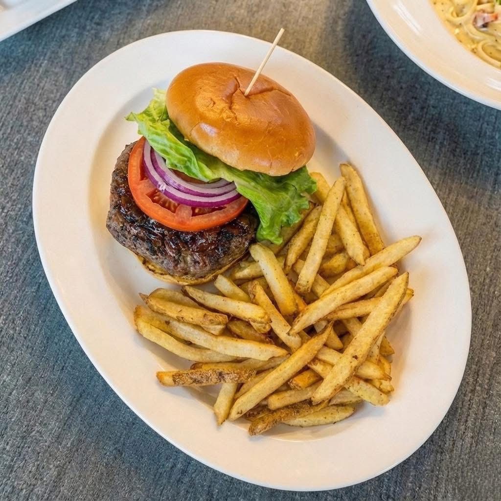 Burger: 8 oz. Grilled Angus Burger topped with a Maple Bacon Jam, Lettuce, Tomato and Onion served with House-cut Pommes Frites
