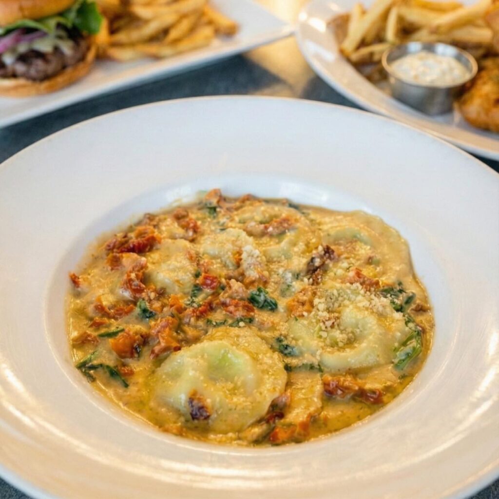 Spinach Ravioli in a Sun-dried Tomato and Kale Cream Sauce