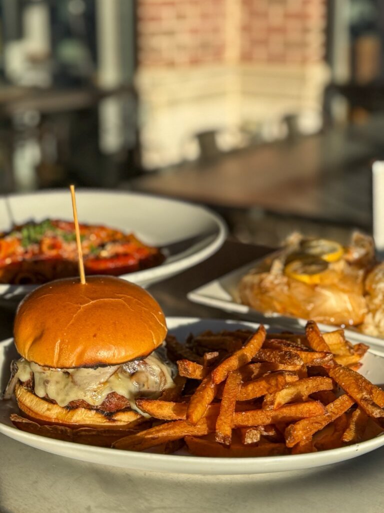 French onion burger topped with provolone, grilled onions, and sautéed mushrooms served with pommes frites