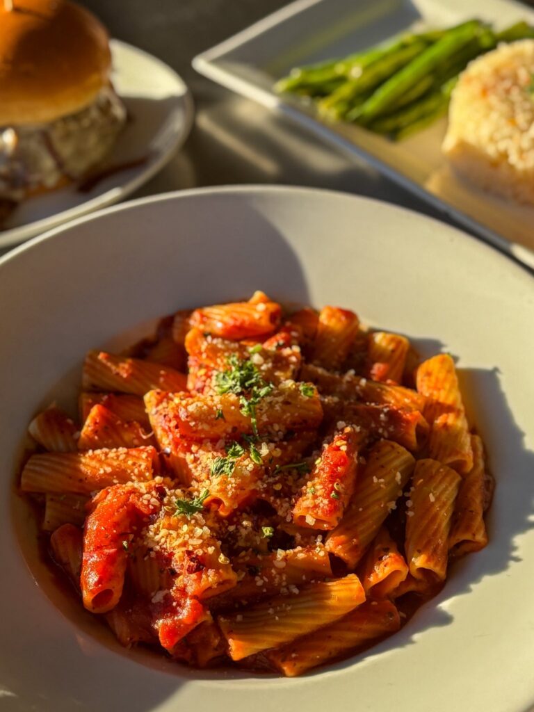 Rigatoni arrabiata (spicy marinara) with option to add grilled chicken or shrimp